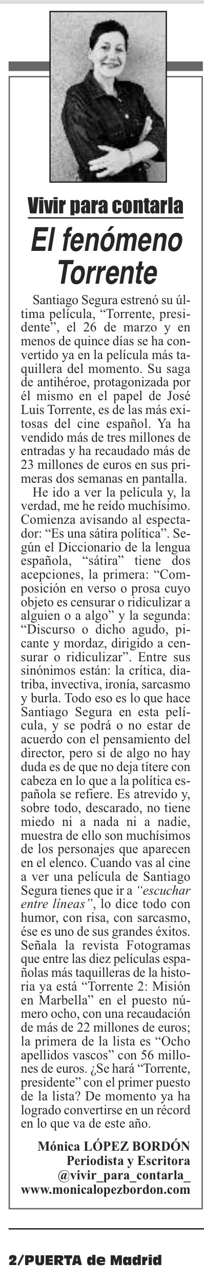 Cuando vas al cine a ver una película de Santiago Segura tienes que ir a “escuchar entre líneas”, lo dice todo con humor, con risa, con sarcasmo, ese es uno de sus grandes éxitos. Señala la revista Fotogramas que entre las diez películas españolas más taquilleras de la historia ya está “Torrente 2: Misión en Marbella” en el puesto número ocho, con una recaudación de más de 22 millones de euros; la primera de la lista es “Ocho apellidos vascos” con 56 millones de euros. ¿Se hará “Torrente, presidente” con el primer puesto de la lista? De momento ya ha logrado convertirse en un récord en lo que va de este año.